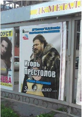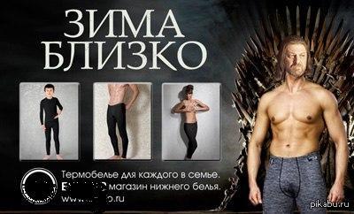 Многие рекламщики хорошо подготовились к этой зиме, так сказать уловили тренд. Все чаще вижу на просторах интернета и в реальной жизни рекламу, плакаты, баннеры с девизом Старков.